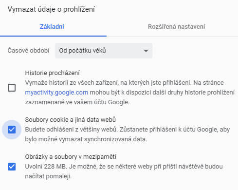 - Pod záložkou Základní zvolíte Časové období Od počátku věků, necháte odškrtnuté Soubory cookie a jiná data webů a kliknete na vymazat data