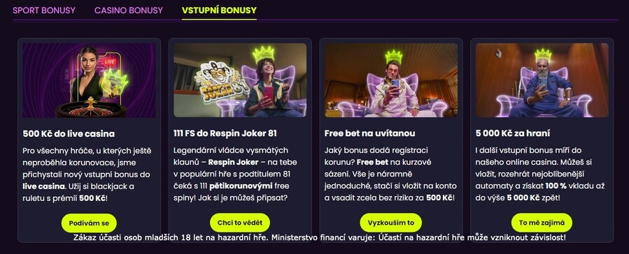 Hrajte zodpovědně a pro zábavu! Zákaz účasti osob mladších 18 let na hazardní hře. Ministerstvo financí varuje: Účastí na hazardní hře může vzniknout závislost! Využití bonusů je podmíněno registrací u provozovatele - více zde.