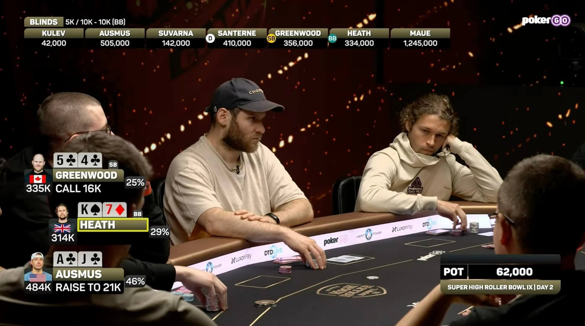 Heath foldnul, ale Jeremy Ausmus, mimochodem aktuální lídr letošního PGT leaderboardu, nebojácně dorovnal. Nejprve ho potěšila dobrá zpráva v podobě 64% šance na výhru. Na stůl však doputovala po turnové T