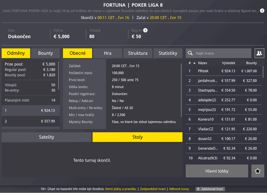 V rámci už třetího podkola této sezóny se tak konal nedělní event FORTUNA | POKER LIGA 8 v Mystery Bounty formátu, který při buy-inu €50 garantoval €5.000. Ani 50 unikátních hráčů, za přispění 30 re-entries, nedokázalo garantovanou částku překonat.