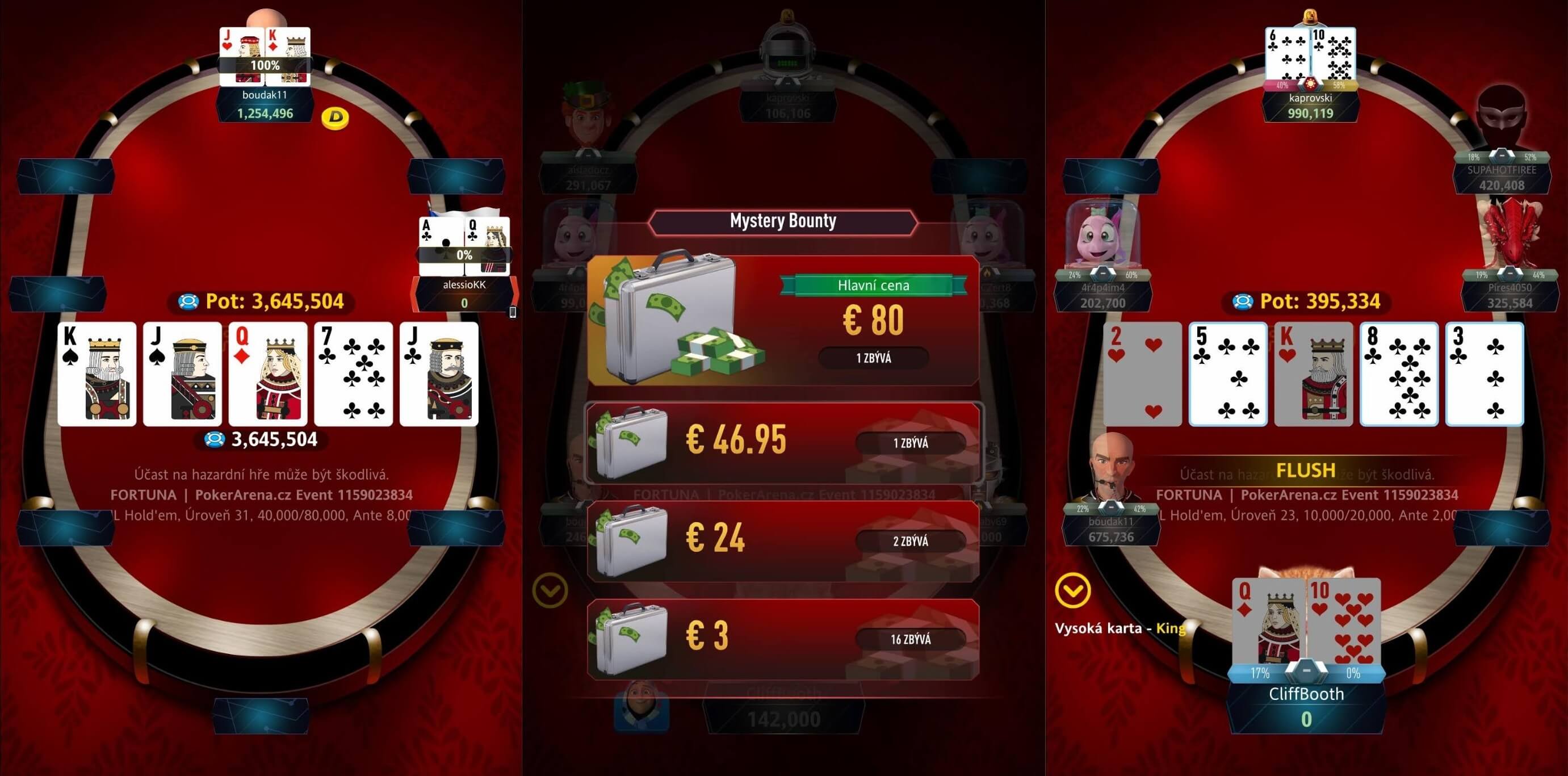 Ve včerejším PokerArena Eventu na Fortuně si pro oficiální vítězství došel boudak11, který za první místo inkasoval €89,34 + €33. Nejvyšší celkovou odměnu ale i díky mystery bounty vybojoval hráč na třetím místě. Kaprovski si odnesl dohromady €161,78. Dosavadní jednička žebříčku SUPAHOTFIREE se opět probojoval na finálový stůl a upevňuje své vedení.