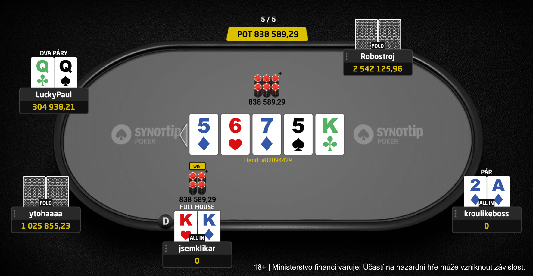 "Klikaře" k triumfu mimo jiné dovedla důležitá preflop točka o turnajový život chvíli před sestavením finálového stolu, kdy s přibližně 11 BB zkompletoval full house s K-K do Q-Q a A-2s!