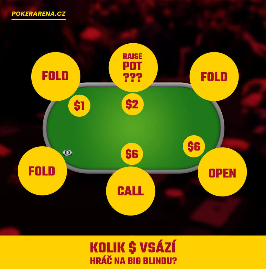 Zůstaneme v preflop fázi a pojďme se pověnovat handě, kterou jsme hojně řešili na našich facebookových stránkách. Jednalo se o situaci v níže uvedené grafice. Při blindech $1 / $2 otevřel hráč na middle position $6. Cutoff ho vycalloval a po foldu ostatních hráčů se rozhodl big blind pro pot raise. Výpočet je následující: