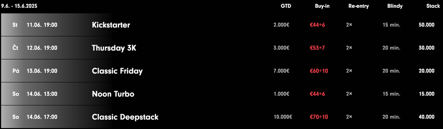 Největší turnaj se koná v sobotu 14. 6. od 17:00. Za vstupné €80 si zahrajete minimálně o €10.000. Do hry obdržíte startovní stack ve výši 40.000 žetonů a 20minutové blindy začínají na úrovni 100/100.