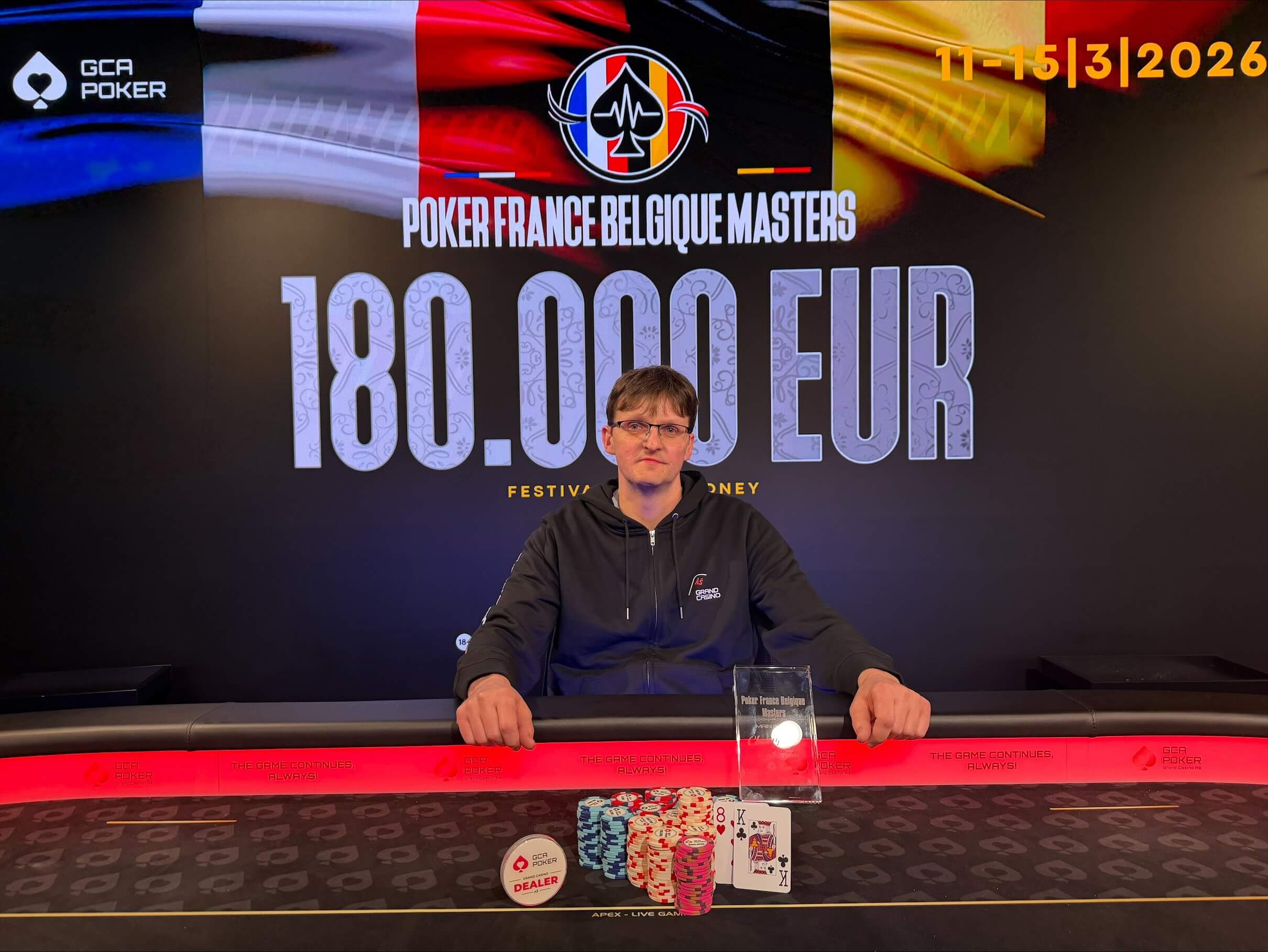 Poker France Belgique Masters Main Event s buy-inem €200 měl od středy do soboty na programu 6 startovních flightů, přesto €100.000 garance odolala. Pořadatelé v Grand Casinu Aš napočítali 464 entries, což znamenalo overlay přes €20.000.