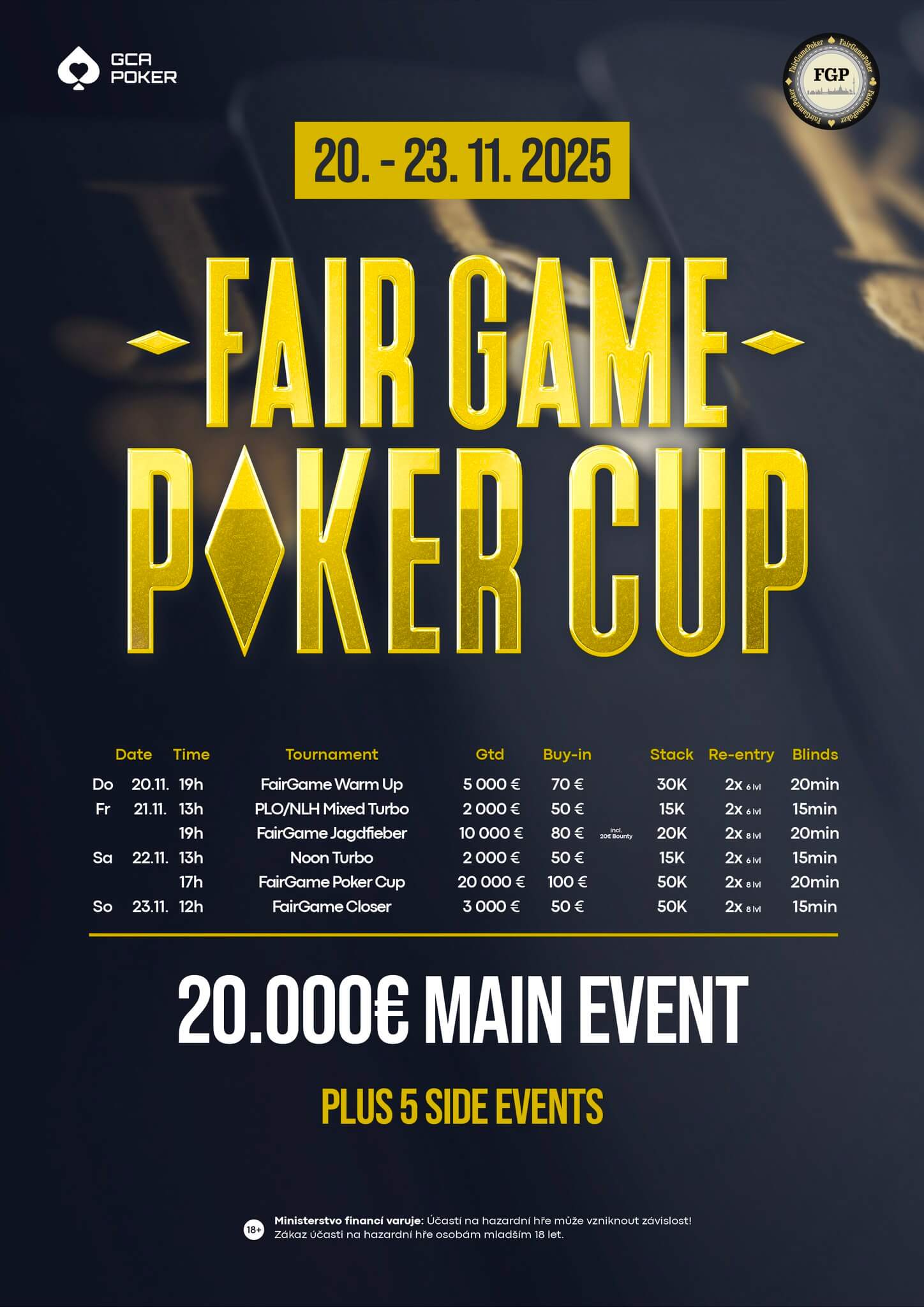 | Čt 20. 11. 19:00 | FairGame Warm Up | 5.000€ | €60+10 | 20 min. | 30.000 |