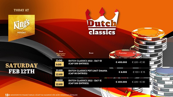 Jeden z největších únorových turnajů King's dnes čeká naprosto zásadní den. Na programu jsou hned dva flighty Dutch Classics Main Eventu, den 1D od 11:00 a následně i den 1E od 18:00. Plán obou rozehrávek je totožný, startovní stack obsahuje 50 tisíc v žetonech, blind levely trvají 40 minut a do zítřejšího druhého hracího dne postoupíte s koncem čtrnácté úrovně.