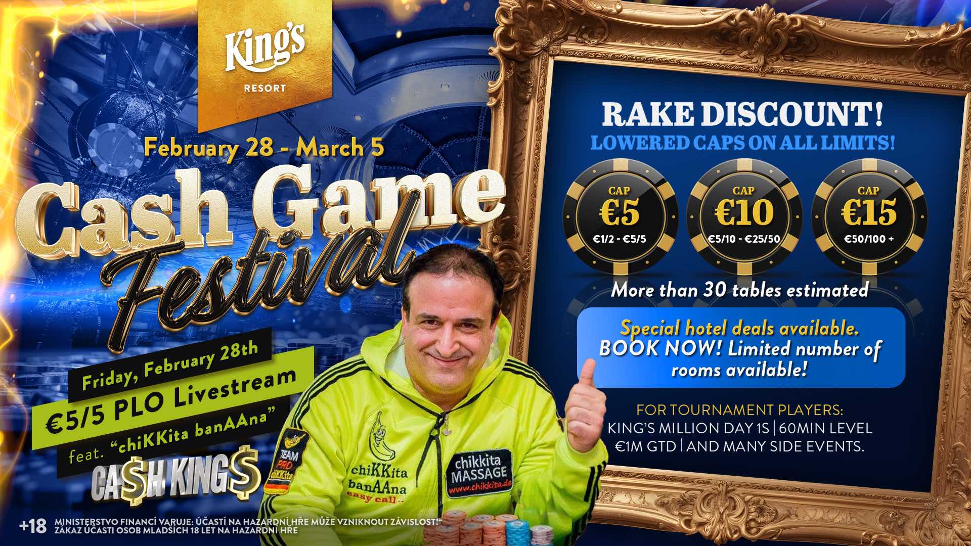 Cash Game Festival se koná v termínu od 28. února do 5. března. Během této doby bude platit snížený CAP na pot, tedy maximální částka, která se strhává jako poplatek kasinu z každého potu.